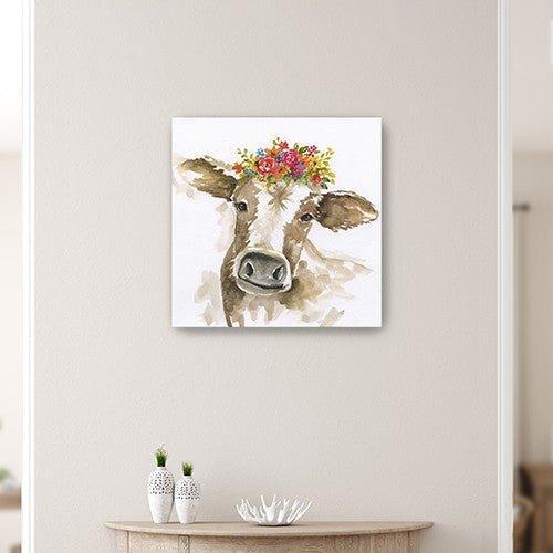 Add some flower flair to your interior with this cute Watercolor Floral Cow Canvas Wall Art. Printed on the highest quality gallery grade canvas using the French giclée technique, this beautiful image of a cute cow wearing a flower crown is showcased expertly, making it the perfect floral and soft art piece for any room. Stretched over a natural pinewood frame, this multi-colored pastel canvas wall art will add a dreamy and floral aesthetic to your space. 20" x 20" x 1.25"