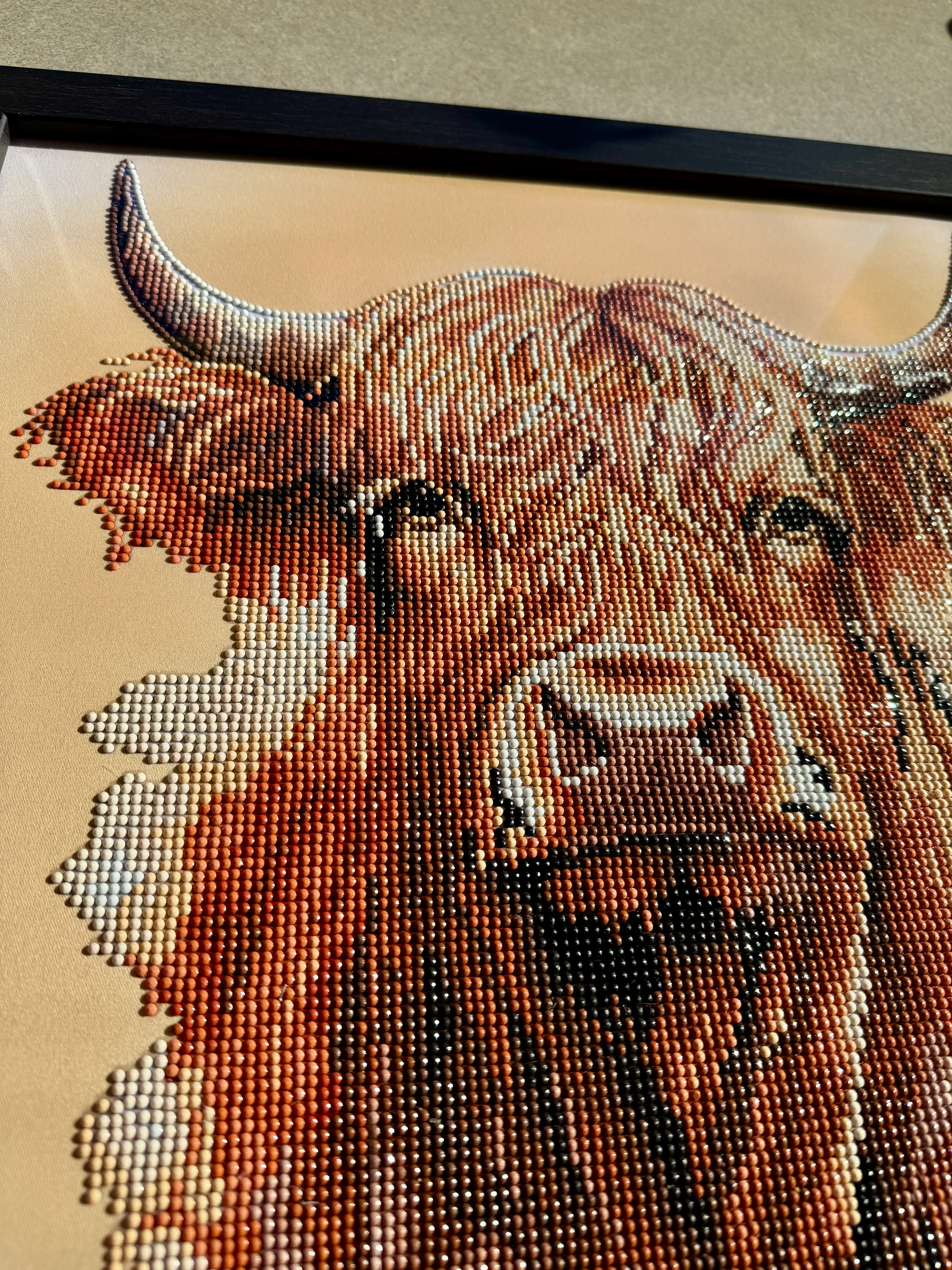 Indulge in the rustic charm of our handcrafted Bos Taurus Taurus - Highland Cow Art Wall Hanging. Each bead is painstakingly hand-placed, resulting in a mesmerizing, shimmering masterpiece that is truly one of a kind.