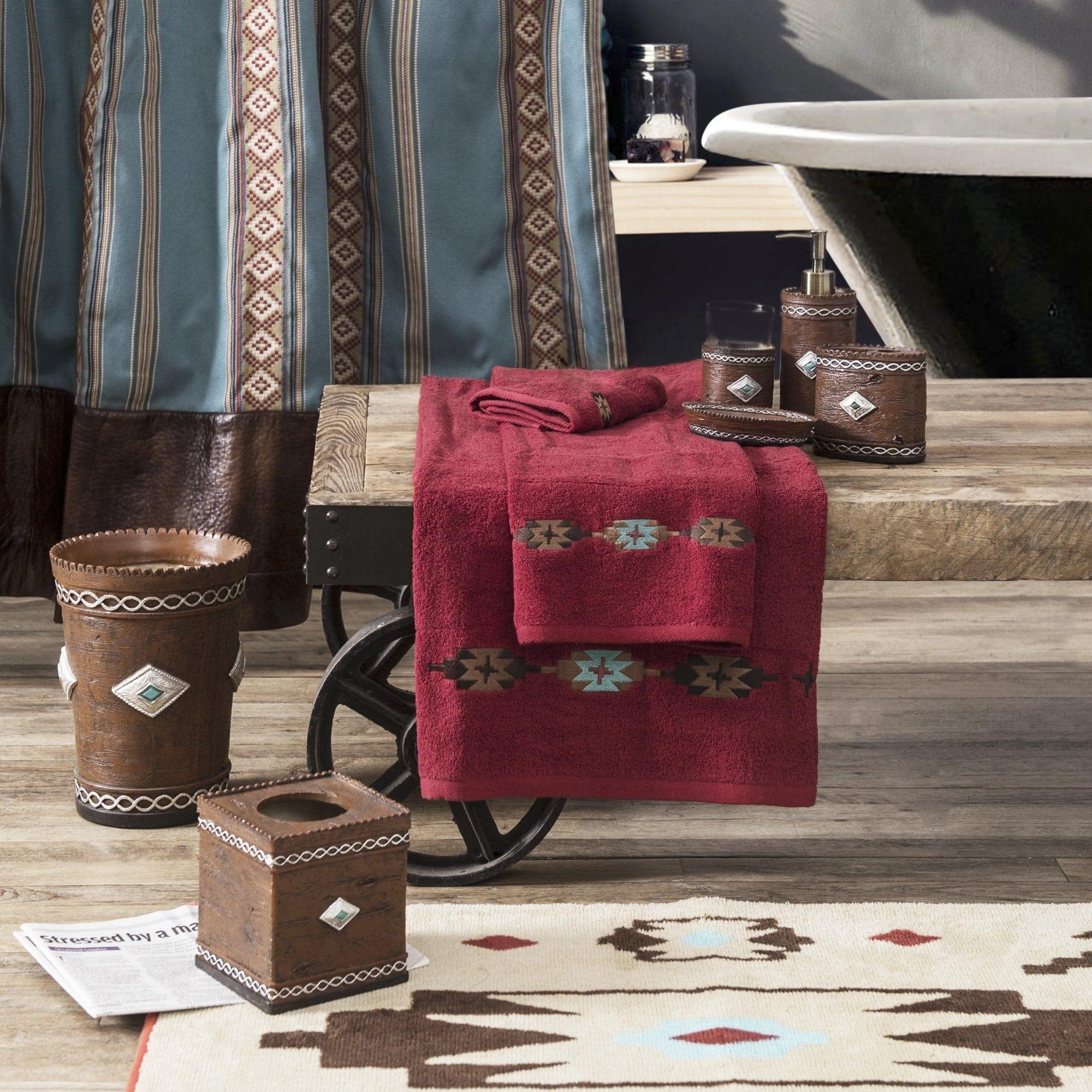 Our 4-pc Diamond Concho Western Bath Accessories set features a western inspired design with a silver and turquoise concho detail around the top and bottom of each piece. Stylish hand-painted detail provides a finished look.