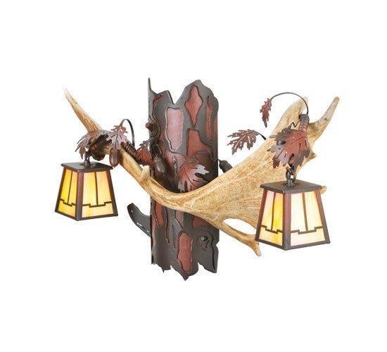 The exquisite Fallow Antler Wall Sconce showcases two radiant bungalow-style lanterns adorned with golden iridescent stained art glass shades. These striking shades hang from a wrought iron backplate textured to resemble oak tree bark. Genuine Fallow Deer antlers entwined with finely detailed metal oak leaves complete the design. This elegant fixture introduces an unparalleled blend of rustic charm, nature-inspired sophistication, and lodge-style refinement to your space.