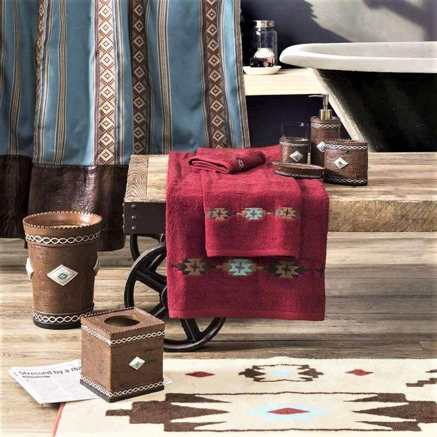 Experience the beauty of traditional Navajo design with our Santa Fe Southwestern Bath Towels. This set of three towels, in vibrant red and turquoise terry cloth, will add a touch of Southwest style to any bathroom. Complete the look with coordinating accessories from our collection. Get yours today!