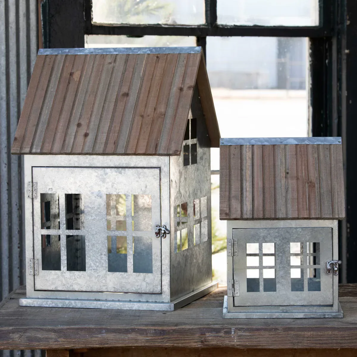 Elevate your holiday decor with our exquisite Wooden Roof Cottages, seamlessly blending with any style. This set of two, each boasting a unique design, adds a delightful touch to any space. Crafted from galvanized tin and adorned with genuine Fir wood roofs, these charming houses glow beautifully when illuminated with a candle, complete with latch-able doors and windows.